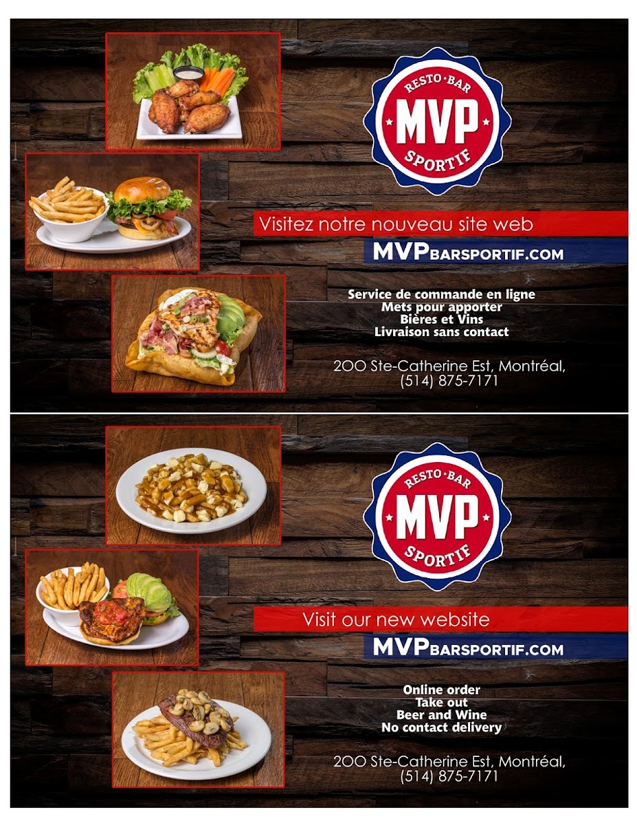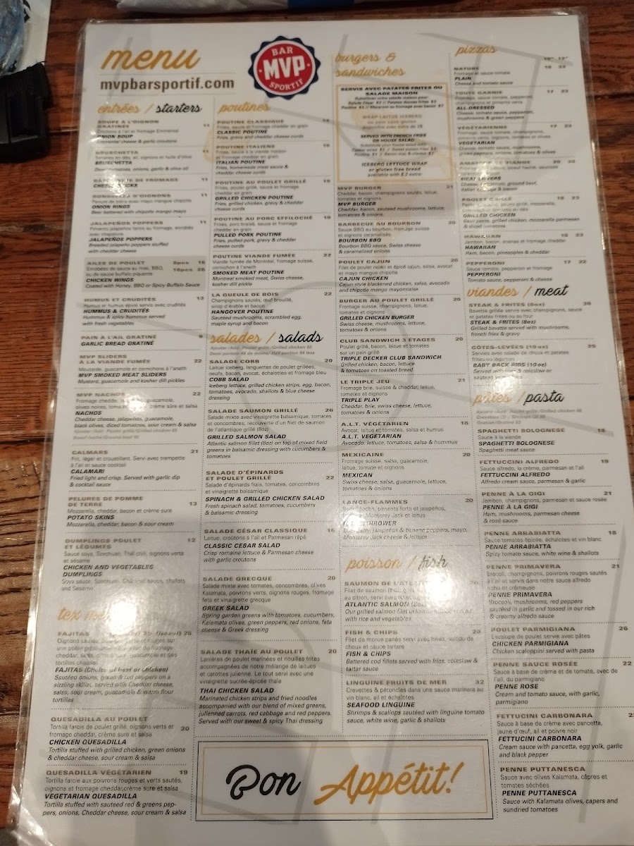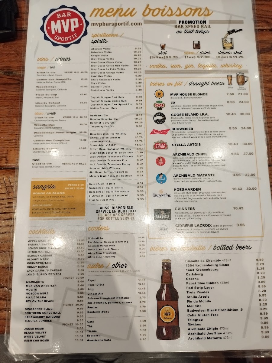 Welcome to MVP Restaurant & Bar Sportif! Located in the heart of Montréal, this sports bar offers a wide range of delicious dishes and drinks for you to enjoy.